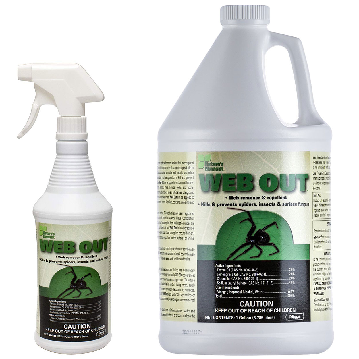 Web Out contains all-natural essential oils and vinegar, and is an EPA 25(b) exempt minimum-risk pesticide. It functions as a contact pesticide to kill spiders and other general pests, but it offers even more: When sprayed on webs, Web Out breaks them down for easier cleaning, and then prevents new webs from being built. Web Out lasts up to four months indoors and 60 days outdoors, depending on weather exposure. It can be applied around people and pets, and can even be used over water on boats and at marinas.