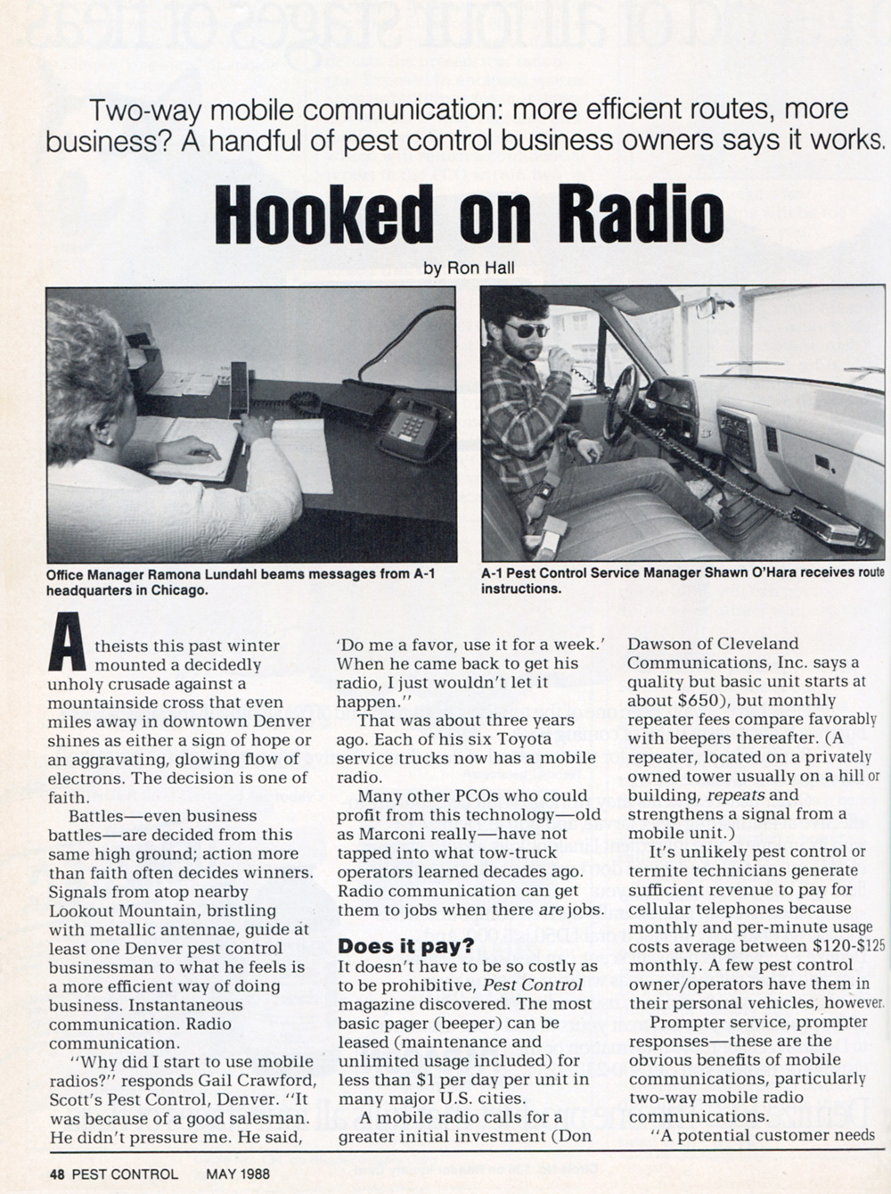 A May 1988 article in Pest Control magazine (Pest Management Professional’s former name), highlighted the advantages of radio communication for routing.